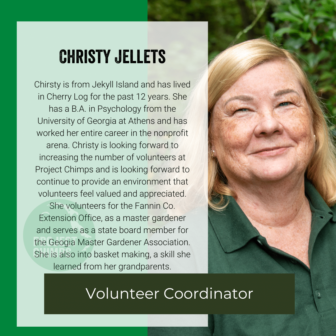 Deanna Stratton is an experienced administrator who works to ensure Project Chimps has capable, diverse, well-trained, forward-looking, and adaptable workforce and volunteer corps. As Project Chimps’ Director of Operations, she oversees human resources, staff recruitment and retention, compliance, accounting, donations administration, merchandise, and volunteer management. Deanna has more than two decades of experience as a human resources manager and is leading our effort to create a culture of excellence for staff and volunteers, as envisioned in our Strategic Plan. Deanna is a world traveler who previously served as human resources manager for the U.S. Consulate in Frankfort, Germany. There, she was responsible for human resources and payroll for 65 employees including recruiting, employee relations, compensation and HR legal compliance under both US and German employment regulations.
