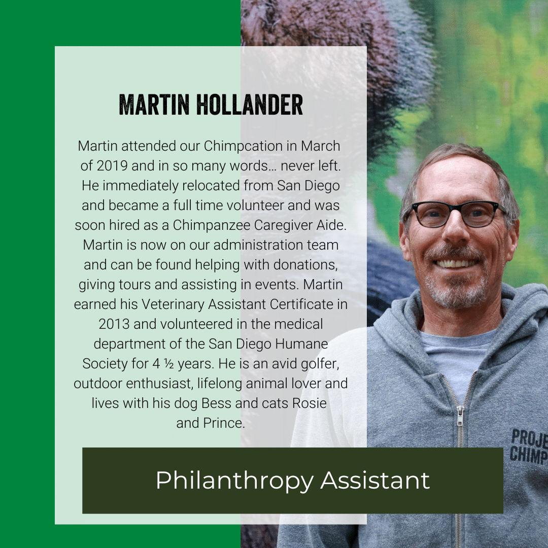 The Philanthropy Department's goal is to raise funds and create meaningful relationships with supporters to keep the sanctuary functioning. They provide daily office and community services including processing donations, leading tours, writing campaigns, overseeing the Legacy Society, the Chimp Club and providing individual updates to chimp sponsors.