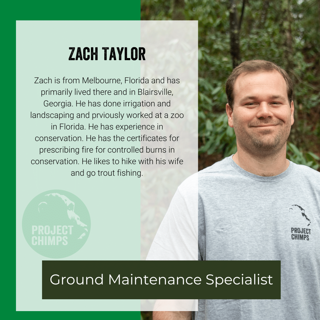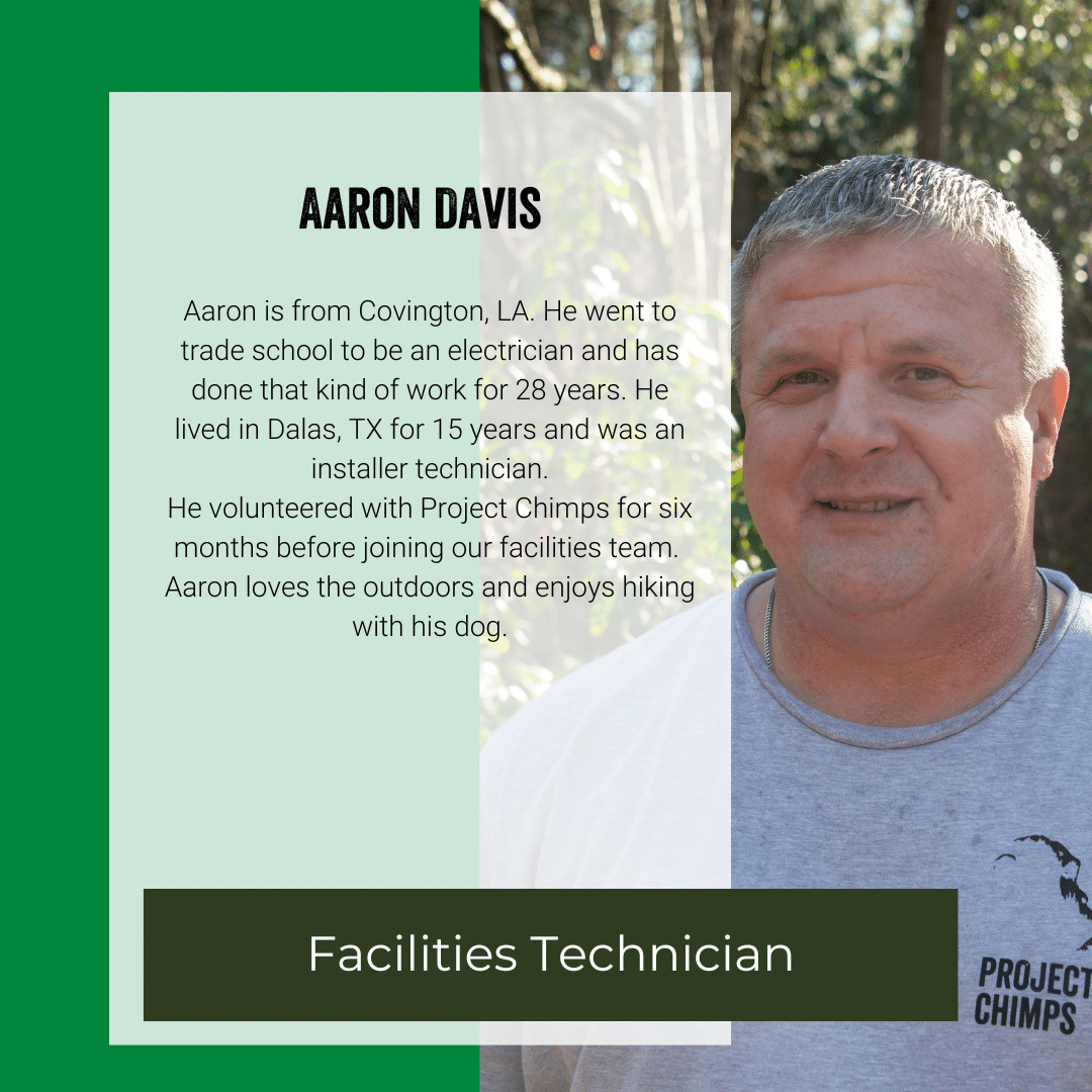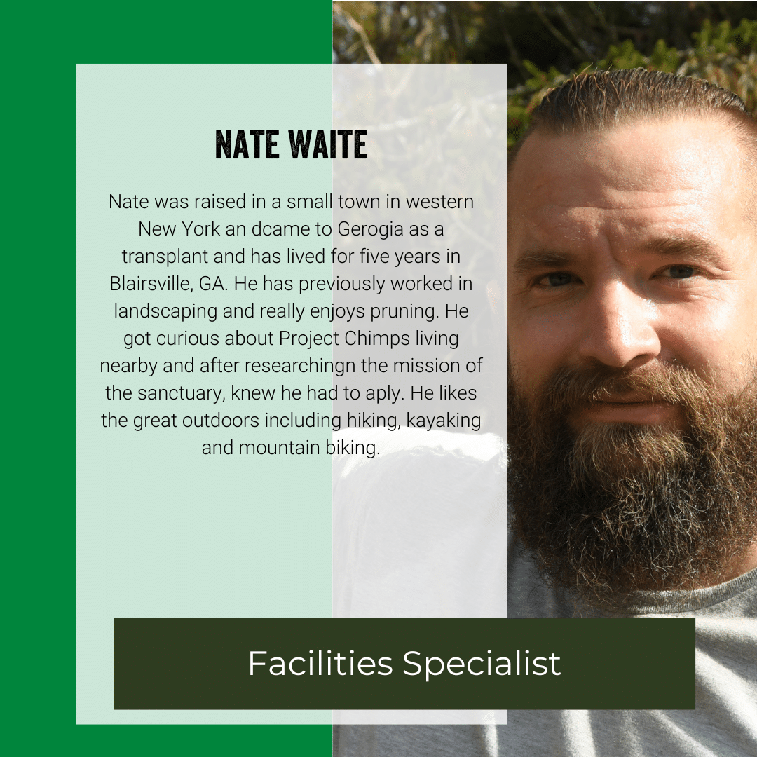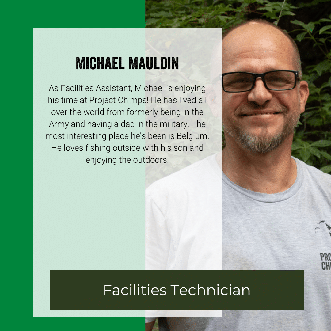 Jim came from New York State where he has lived for 56 years. In New York, he owned an auto repair garage. He needed a change coming to Georgia and found a new sense of community here in the Blue Ridge Mountains and joined Project Chimps in 2022. In 2025, he moved his way up from Facilities Maintenance Specialist to Manager of Facilities.