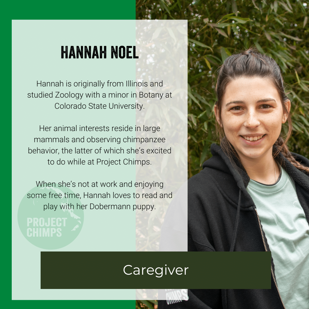 Jesse Ellsworth joined Project Chimps in June as a Veterinary Assistant. Jesse recently spent more than a year working as a veterinary assistant in Texas. At the end of 2022 she switched to chimp caregving.