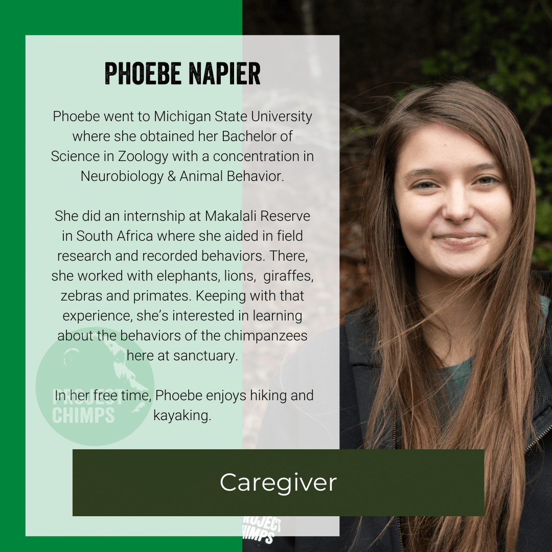 India came to Project Chimps as a Chimp Care Intern in September of 2021 and was hired on as a part-time Caregiver Aide and part-time Administrative Assistant before becoming a full-time Caregiver in 2022. In 2026 she was promoted to supervisor.