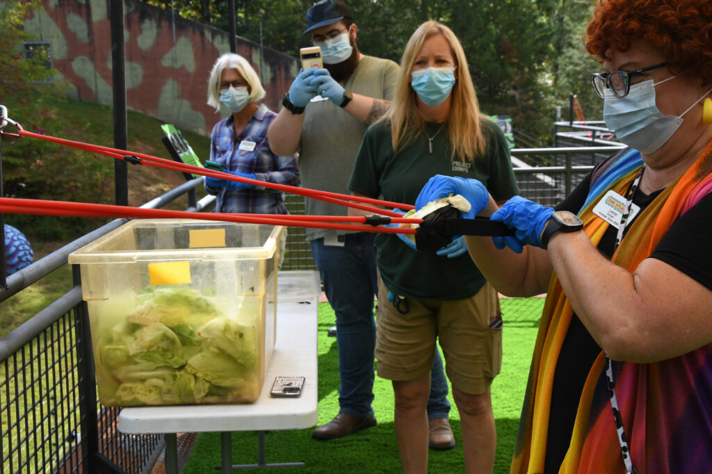For an additional $250 your group can participate in the Launch Lunch! This one of a kind experience allows you to help feed the chimps by serving them their veggies directly to them in their habitat. How might you do this you ask? With slingshots! By distributing their lunch with the sling shot, the chimps are encouraged to forage for their meal, much like they would do in the wild.